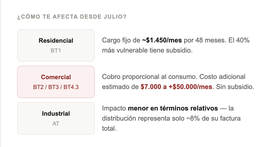 Apr 7, 2026 1:01:39 PM ¿Qué va a pasar con tu factura eléctrica en 2026? Equipo Clickie Compartir: facebook-f icon linkedin-in icon Twitter icon pinterest-p icon envelope icon El año está dividido en dos mitades muy distintas. Esto es lo que necesitas saber antes de julio. EficienciaEnergética, gestorenergetico, energia, MonitoreoEnergia, #ahorro, gestionhídrica, EnergyManagementSystem, Chile, EmpresasChile